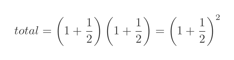 We can express this as a formula. Twice a year, we have interest added to the account that is worth half of the amount in the account. This is equivalent to multiplying the value of the account by one plus a half, and this happens twice, so the total amount is: