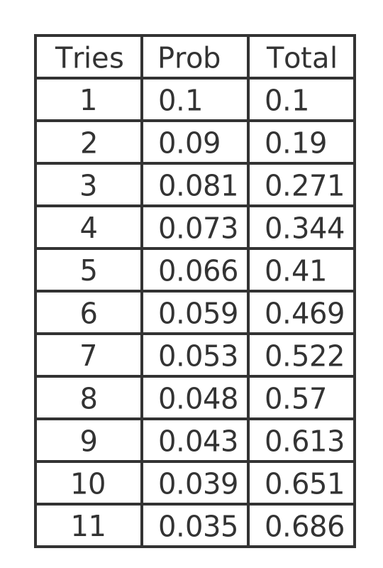 Here, p is the probability of success (0.1), and q is the probability of failure (1 - p or 0.9). Based on this formula we can create a table of the exact probability of finding the correct key on any particular attempt: